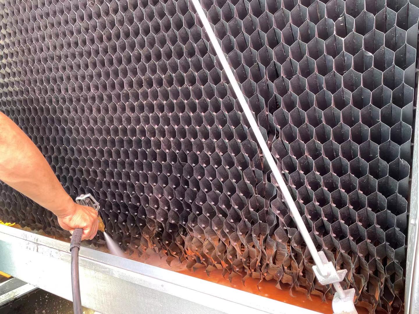 對系統進行致中性清洗,清洗藥劑為:JJ701致中性清洗劑(見圖5.1),循環時間為24小時以上,完成后排出系統內污水(圖5.2),對冷卻塔填料及積水盤內的銹垢行高壓水槍沖洗(圖5.3),清洗完成基本無銹垢及污物(圖5.4)